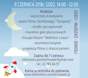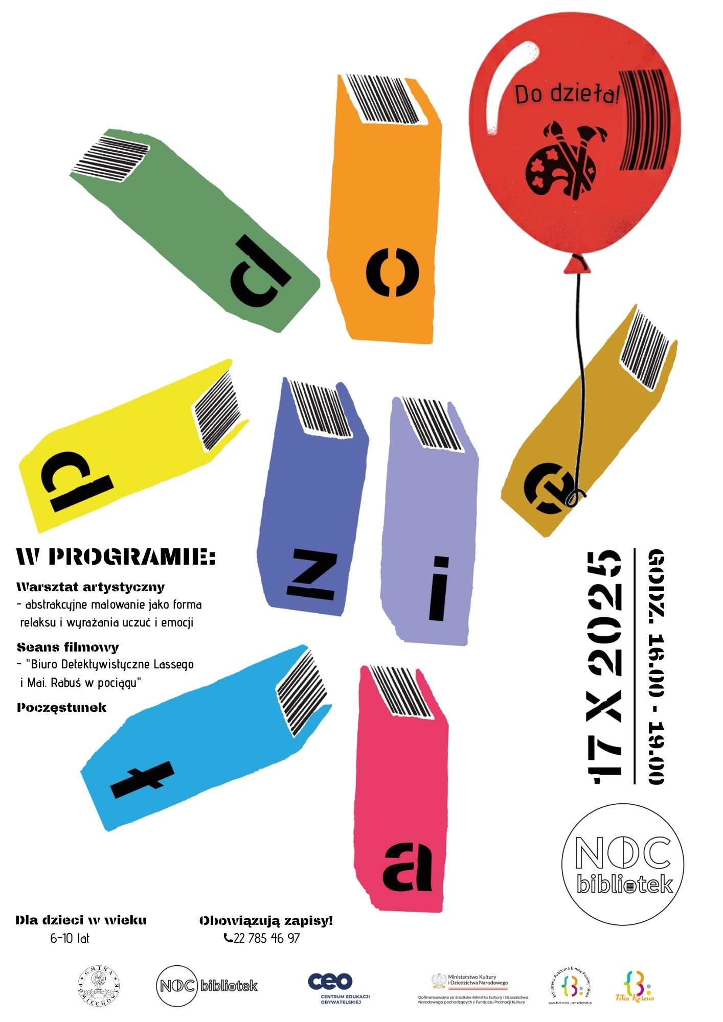 Serdecznie zapraszamy dzieci w wieku 6 – 10 lat na warsztaty artystyczne (dowiemy się co to jest abstrakcja, poczytamy, pobawimy się w kalambury i stworzymy abstrakcyjne dzieła) oraz seans filmowy ”Biuro Detektywistyczne Lassego i Mai. Rabuś w pociągu”. Nie zabraknie też drobnego poczęstunku oraz popcornu.