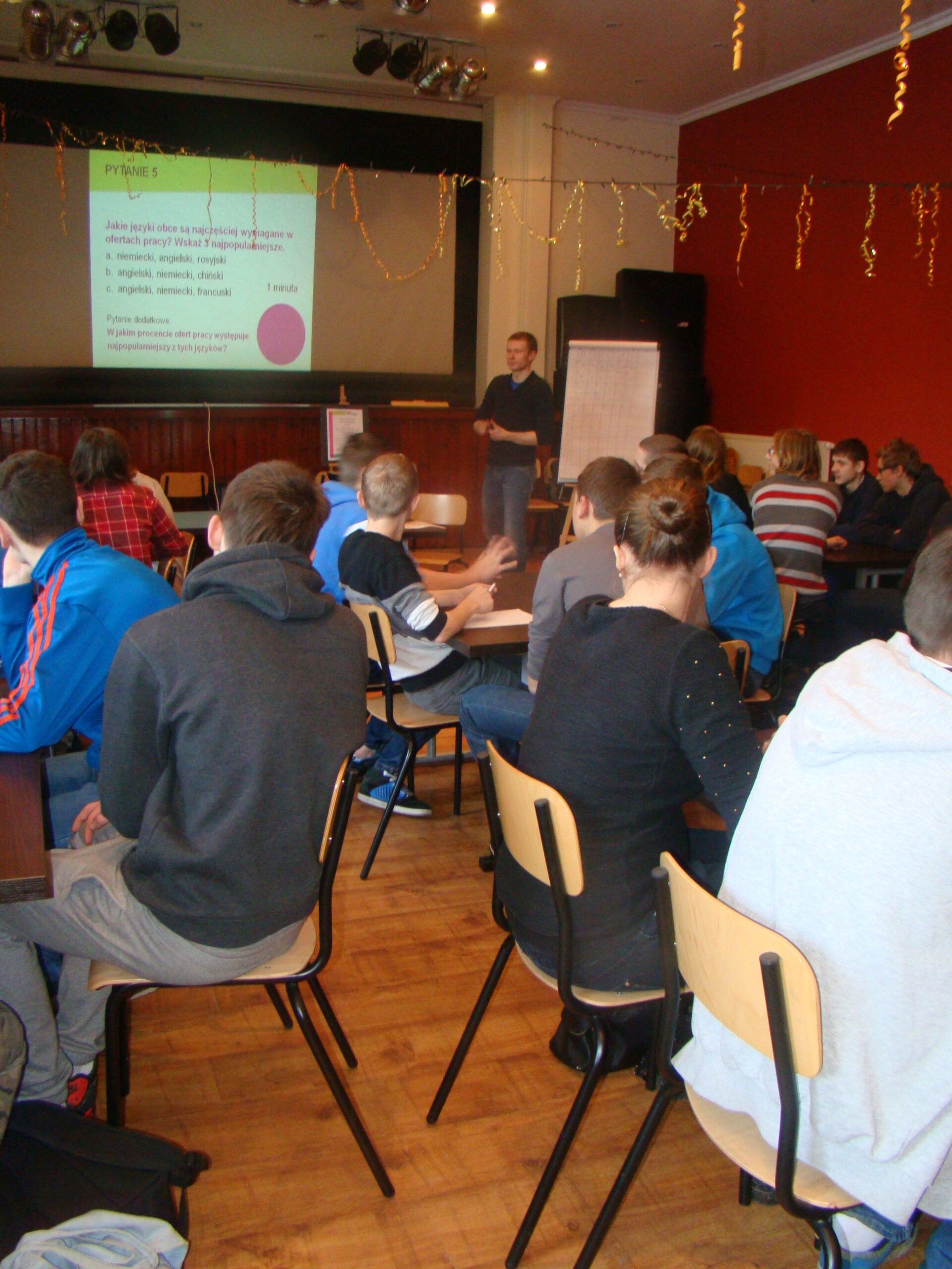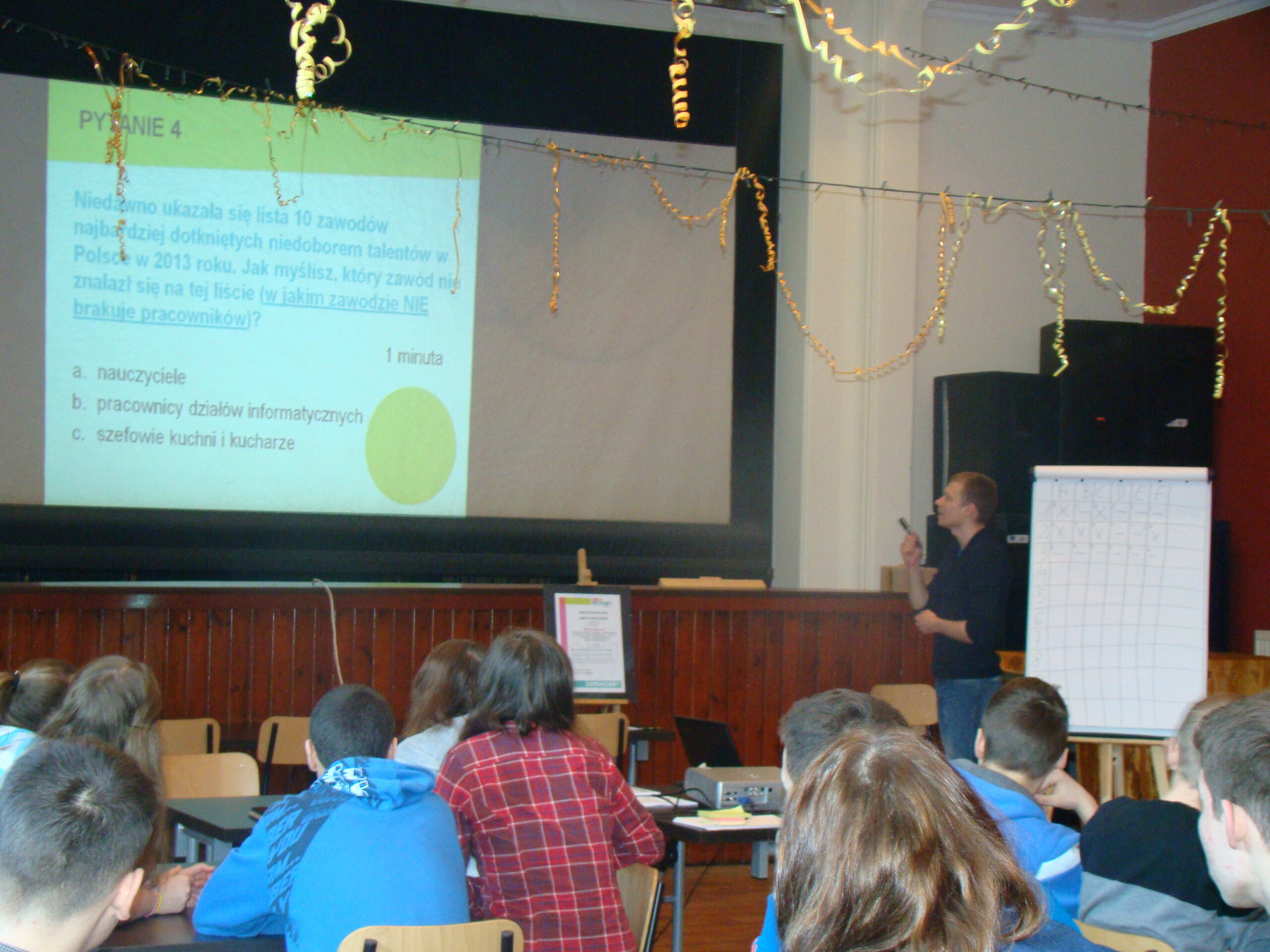 W spotkaniu wzięło udział 30osób – uczniów pomiechowskiego gimnazjum. Dowiedzieli się,jak wygląda dzień pracy młodego profesjonalisty, wspólnie rozmawiali o nowych zawodach i zastanawiali się, które z nich są najbardziej przyszłościowe. Całość miała charakter warsztatowy – był quiz, pytania, wspólne ćwiczenia.