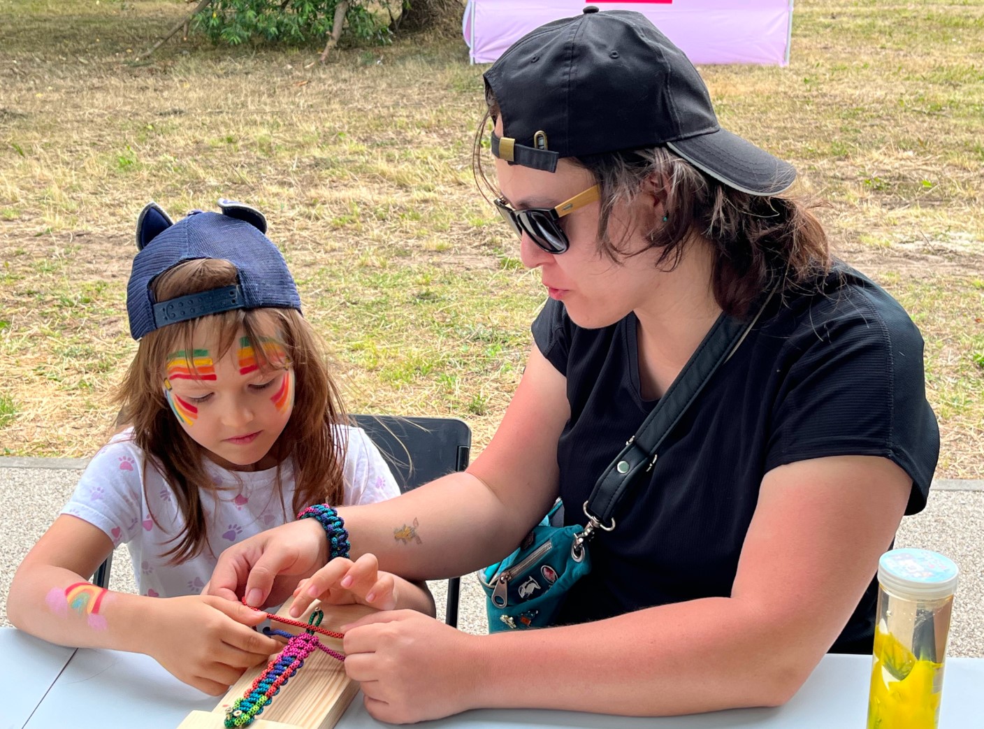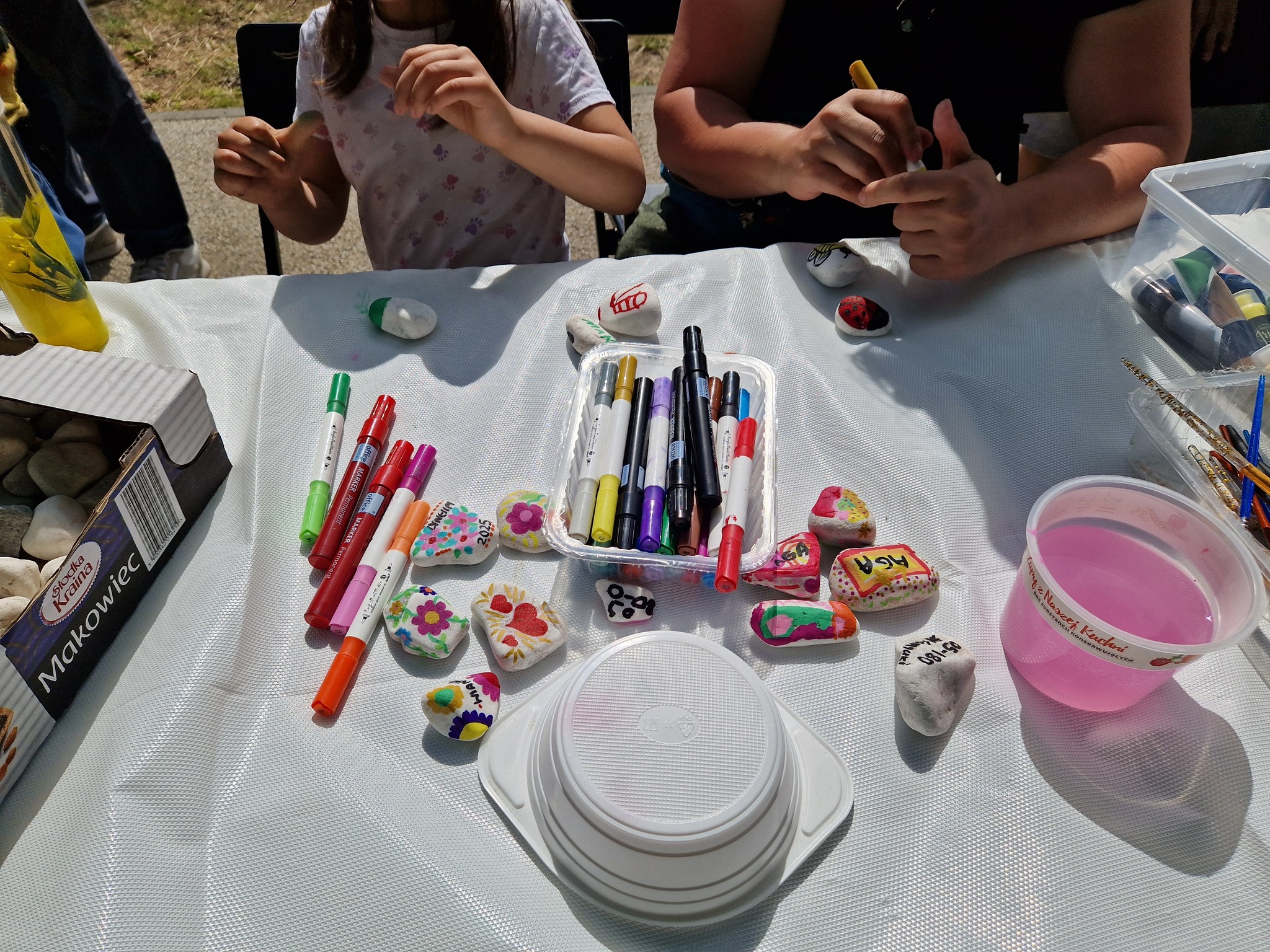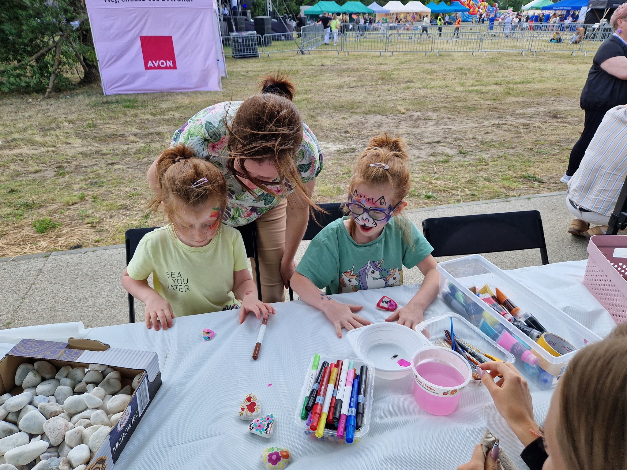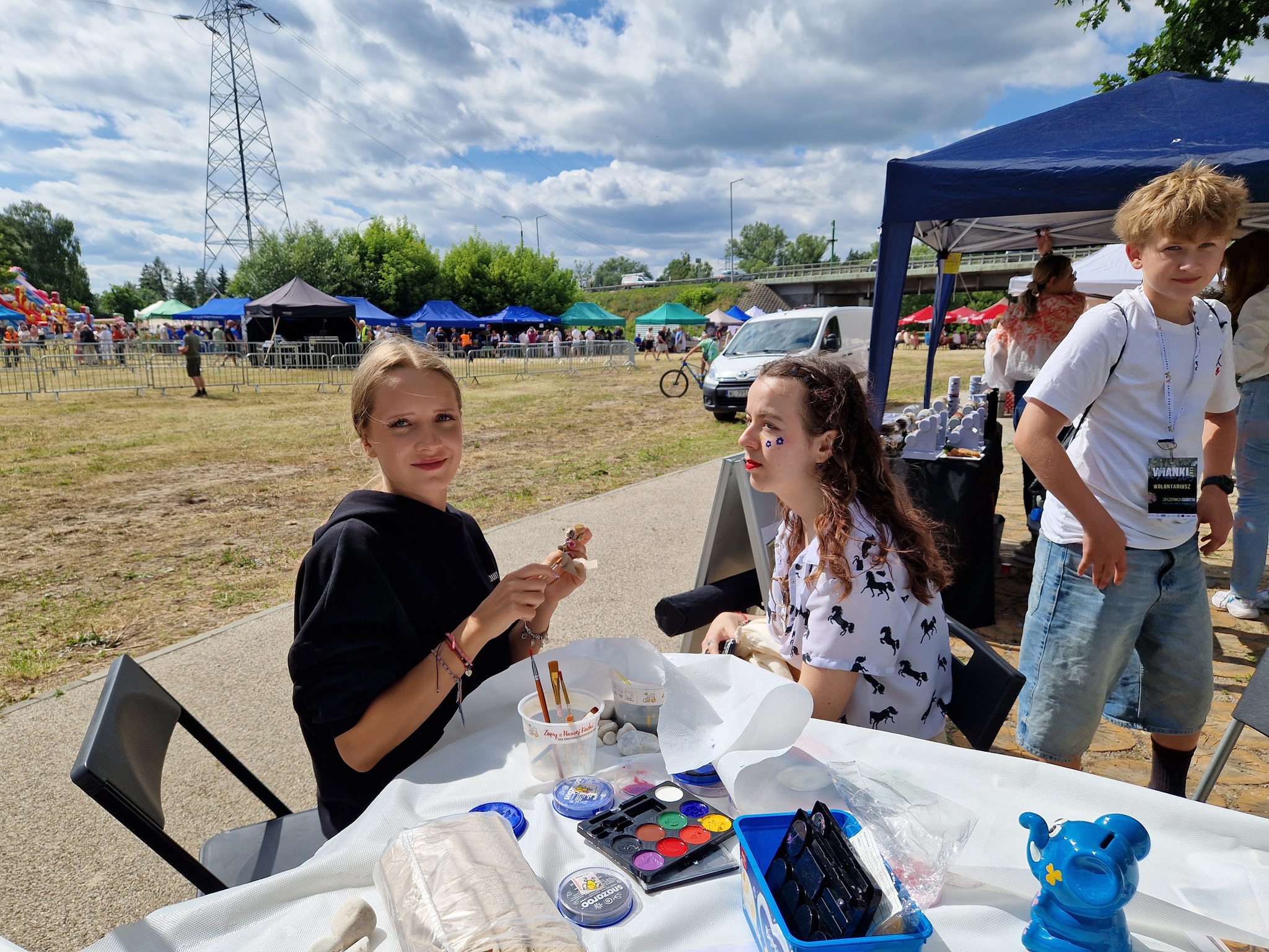 W stoisku bibliotecznym zadbaliśmy aby najmłodsi imprezowicze miło i pożytecznie spędzili ten czas. Także dorośli chętnie przyłączyli się do naszych warsztatów. I mali i duzi z zapałem zaplatali z nami bransoletki survivalowe z linki spadochronowej, a także ozdabiali kamienie oraz słuchali na czym polega idea ich chowania i znajdowania. Najmłodsi jak zwykle oblegali nasze wolontariuszki malujące dziecięce buzie.